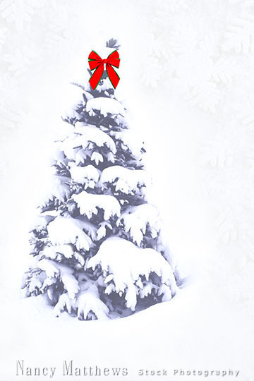 Description: snowy tree with a red bow