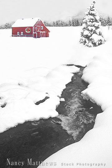 Description: red barn and tree with a stream
