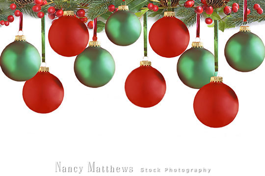 Description: red and green ornaments hanging from pine