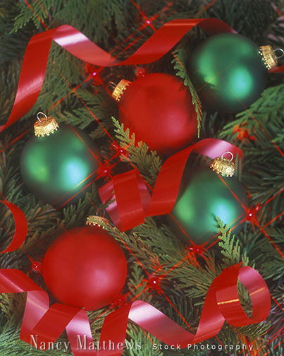 Description: red and green ornaments with ribbon