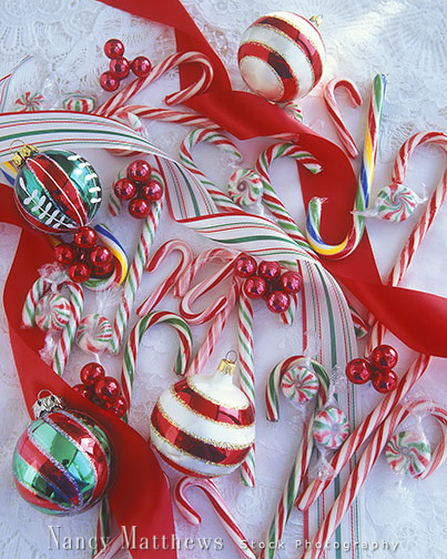 Description: ornaments and candy canes with ribbon