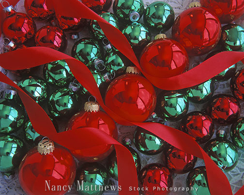 Description: red and green ornaments with ribbon