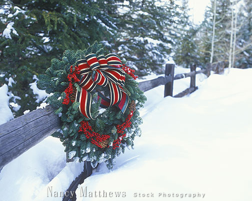 Description: wreath on a snowy fence