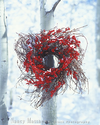 Description: berry wreath in a snowy woods
