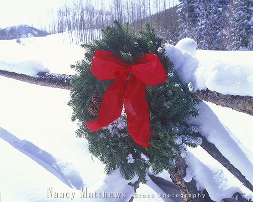 Description: wreath with a red bow on a snowy fence