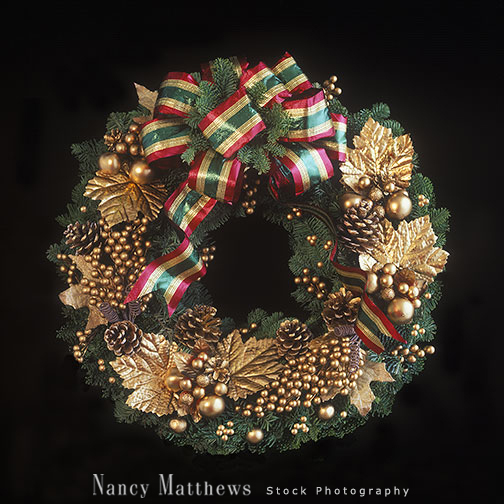Description: wreath with bow and gold ornaments