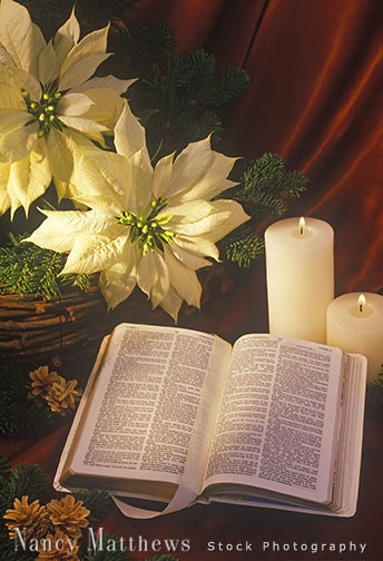 Description: bible with candles and poinsettias