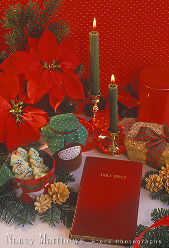 Description: bible with poinsettias, candles and food