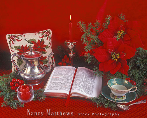 Description: bible with poinsettias and tea items