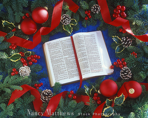 Description: bible with ribbon, pine and ornaments
