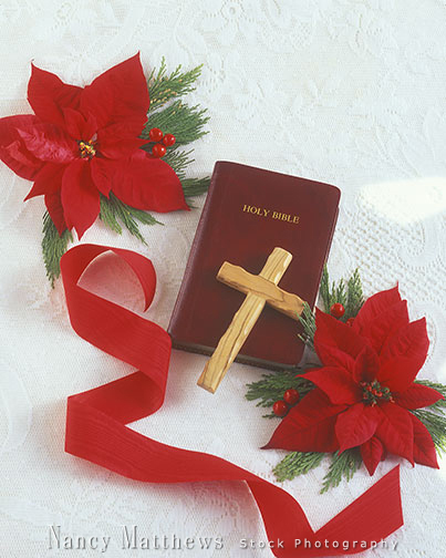 Description: bible and a cross with poinsettias