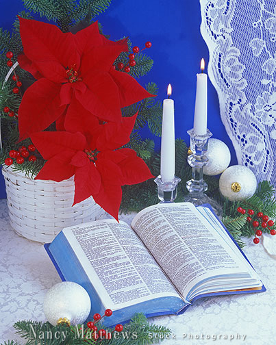 Description: bible with a poinsettia basket and candles