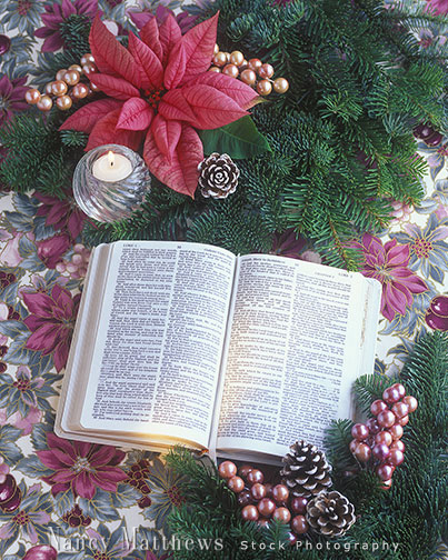 Description: bible with a pink poinsettia and a candle