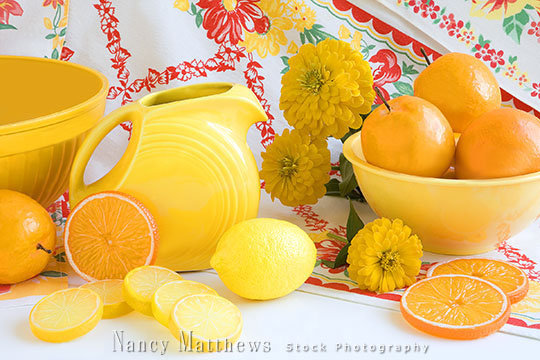 Description: oranges and lemons with a yellow pitcher