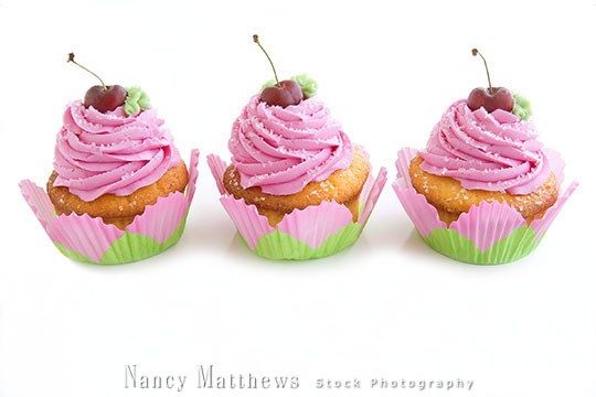 Description: three cupcakes with cherries