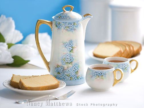 Description: teapot with coffee cups and cake