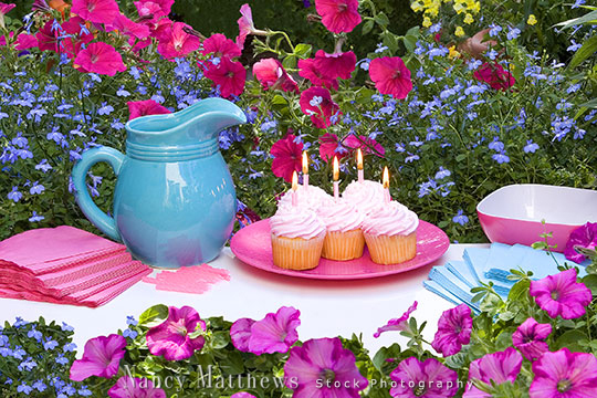 Description: cupcakes and a pitcher in a garden