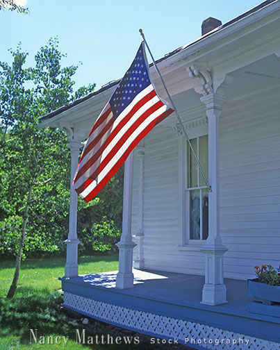 Description: white porch with american flag