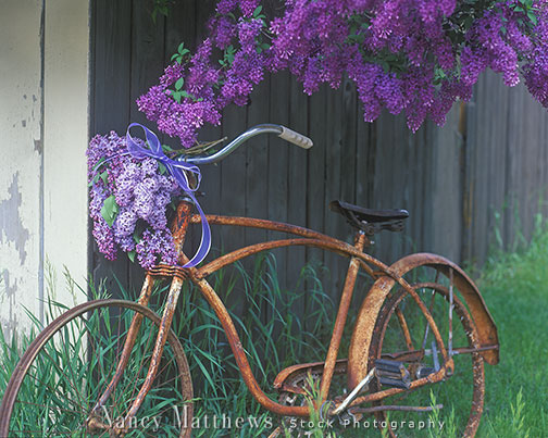 Description: bicycle with a lilac bouquet