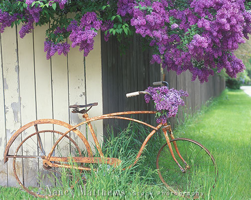 Description: bicycle with a lilac bouquet