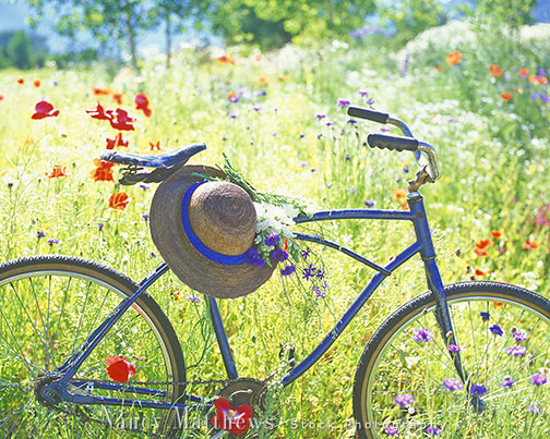 Description: bicycle with a hat in wildflowers