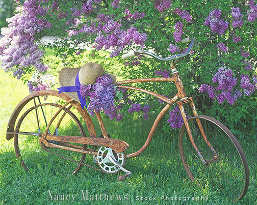 Description: bicycle with a hat and lilacs