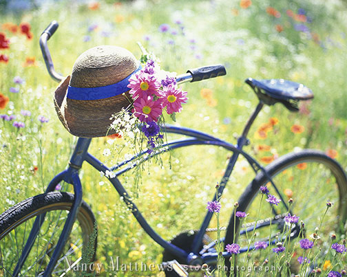 Description: bicycle with a garden hat and flowers in a field of wildflowers