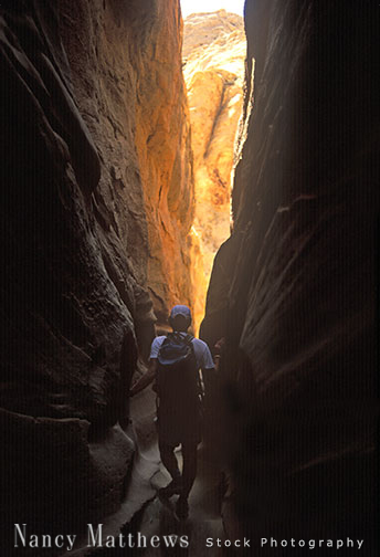 Description: hiker in a slot canyon in utah