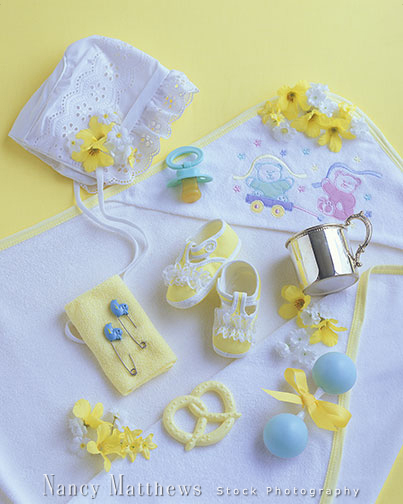 Description: baby items on a blanket