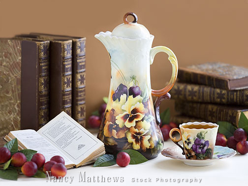 Description: teapot with a cup and books