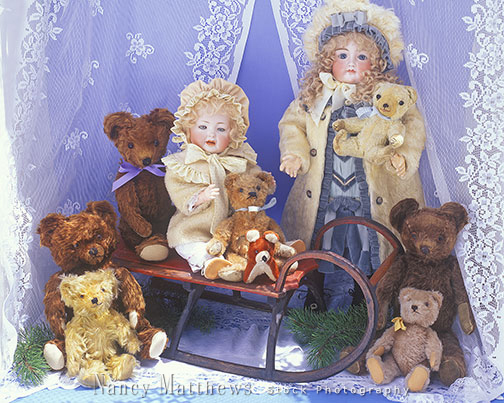 Description: antique dolls and teddy bears with a sleigh