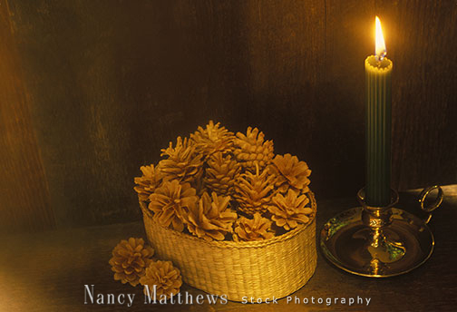 Description: candle with a basket of pine cones