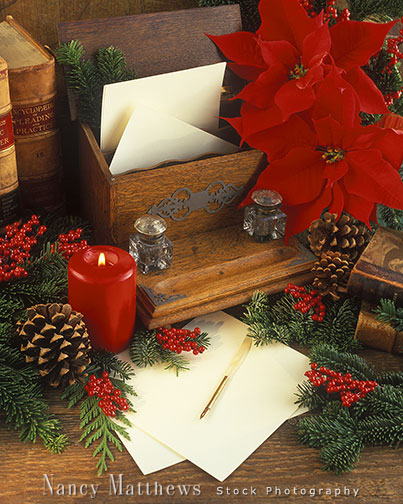 Description: desk with writing paper and poinsettias
