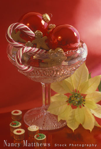 Description: glass bowl with candy canes and ornaments