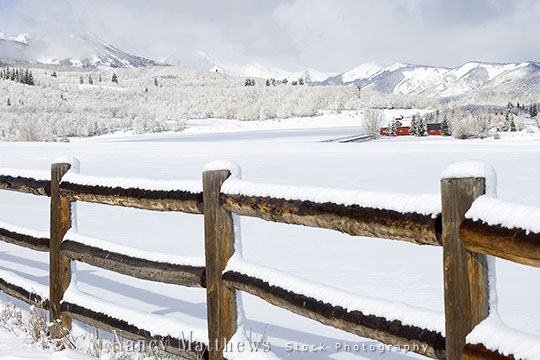 Description: red barn in snow and a fence