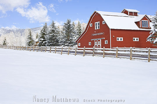 Description: red barn in snow with blue sky