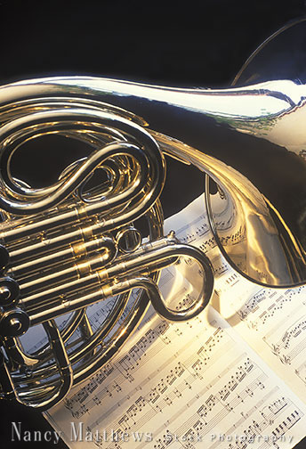 Description: french horn with sheet music