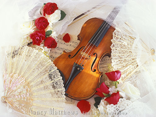 Description: violin with red roses and fans