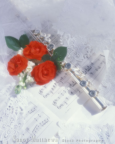 Description: flute with red roses and sheet music