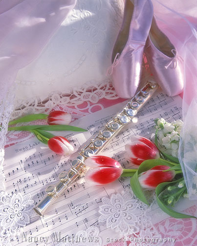 Description: flute with sheet music and ballet slippers