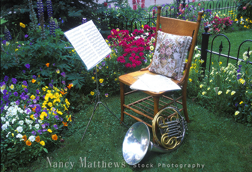 Description: french horn in garden
