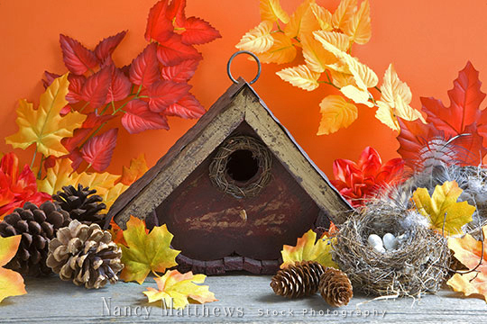 Description: fall birdhouse with leaves