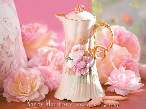 Description: pink roses with a teapot
