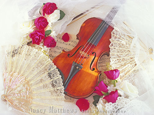 Description: violin with pink roses and fans