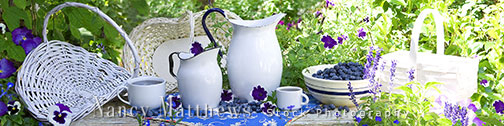 Description: white pitchers with blueberries in the garden