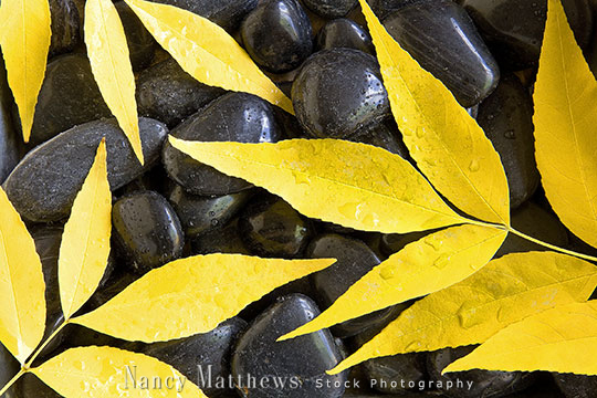 Description: yellow leaves on black stones