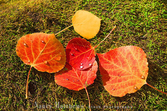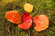 Description: aspen leaves on forest moss