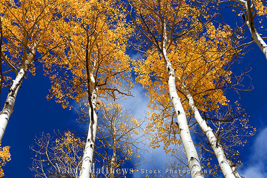 Description: golden aspen trees with a blue sky