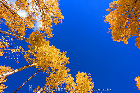 Description: golden aspen trees with a blue sky
