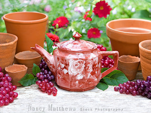 Description: teapot with flower pots in a garden